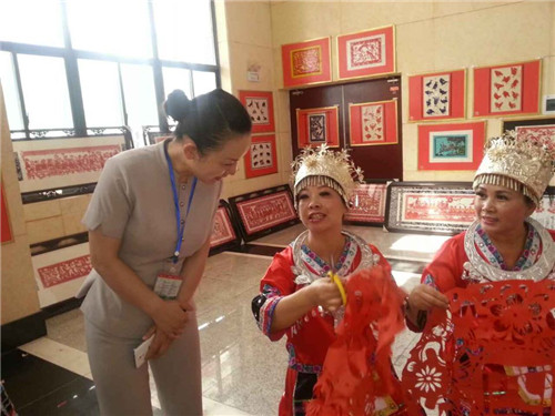 湖南省文化厅厅长李晖与苗族剪纸手工艺人交谈
