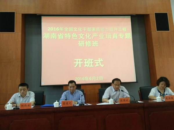 6月2日,2016年全国文化干部素质能力提升工程“湖南省文化系统特色文化产业培育专题研修班”开班仪式在北京中央文化干部管理学院举行。中央文化管理干部学院副院长段周武,湖南省文化厅党组成员、副厅长肖凌之等出席开班仪式。