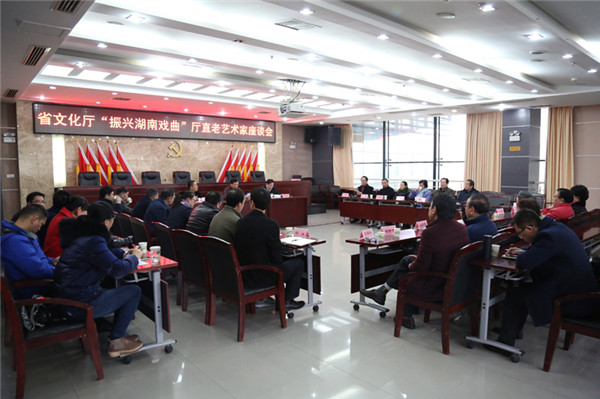 为贯彻落实中央《关于实施中华优秀传统文化传承发展工程的意见》和湖南省《关于支持戏曲传承发展的意见》,2月6日上午,湖南省文化厅邀请厅直单位老艺术家代表,在湖南省文化馆召开了“振兴湖南戏曲”座谈会。老艺术家周祥辉、邹世毅、左大玢、王永光、李小嘉等参加座谈,厅党组副书记、副厅长禹新荣主持座谈会并讲话,副厅长鄢福初,厅副巡视员王鹏及厅机关相关处室负责人参加座谈。