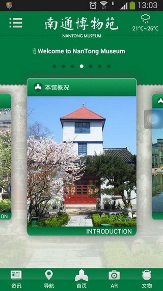 据悉,此次掌上博物馆是南通博物苑新馆展陈更新的一个子项目,南通博物苑为此特别成立了展陈更新电子组。界面设计方面,借鉴了该苑VI视觉识别系统,整体布局、色彩搭配上给人一种清新明快、温馨自然的感觉。栏目方面,首页共有5个一级栏目——资讯、导航、主页、AR、文物;其中主页屏幕中间以苑内6个主要展馆建筑图片作为各个展厅的快捷入口。文物展示方面,共展示130个文物,其中不仅有历史文物,还有自然标本、珍稀古树、中草药植被等。