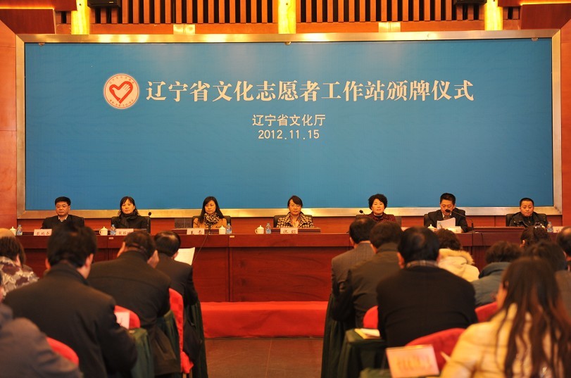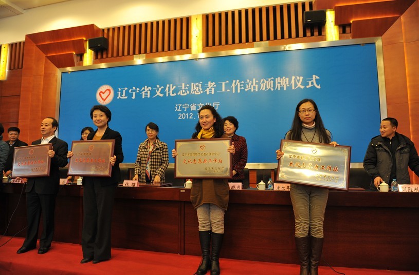 11月15日,辽宁省文化厅在辽宁大剧院举办了“辽宁省文化志愿者工作机构”颁牌仪式,省文明办、省文化厅负责同志向各市文广新局颁发了“辽宁文化志愿者工作办公室”牌匾,向省图书馆、博物馆、群众艺术馆、非遗中心及省直各艺术表演团体颁发了“辽宁省文化志愿者工作站”牌匾。颁牌仪式上,省文化厅还表彰了在今年“学习郭明义,传承雷锋精神”主题群众文化活动中做出突出贡献的文化志愿者团队和相关单位。