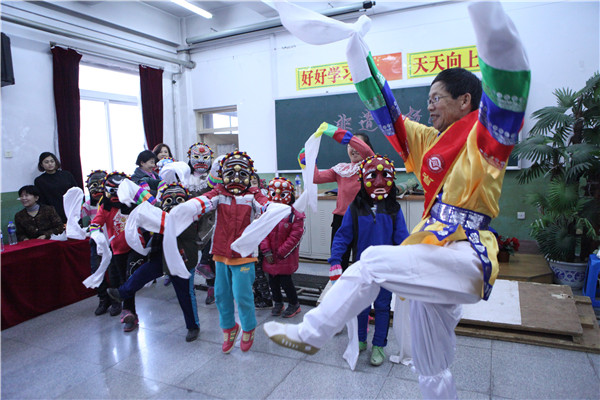 朝鲜族农乐舞(铁岭朝鲜族面具舞)传承人李永浩与学生们互动