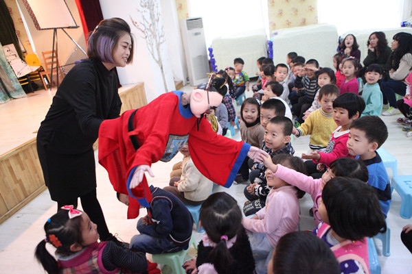辽西木偶戏项目代表杨洋与辽宁省实验幼儿园的孩子们互动
