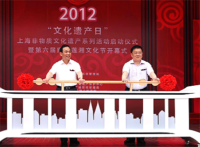 6月8日上午,2012年“文化遗产日”上海非物质文化遗产系列活动启动仪式暨第六届廊下莲湘文化节开幕式在金山区廊下生态园莲湘广场举行。市文广影视局、市文物局局长胡劲军、中共金山区党委书记杨建荣,市文广影视局副局长王小明,中共金山区委副书记祝学军,中共金山区委常委、统战部长李华桂,中共金山区委常委、宣传部长张权权,金山区人民政府副区长陆瑾等有关领导,市非物质文化遗产保护工作局际联席会议成员单位市发改委、市民族宗教委、市财政局、市城乡建设委、市委农办、市新闻出版局、市文联等有关部门有关领导,金山各委办局、各街镇有关领导出席活动,全市各区、县文化(广)局、有关项目保护单位的负责同志,上海市非物质文化遗产项目代表性传承人、保护工作专家、有关社会组织、民间团体和市民代表共800余人参加了活动。