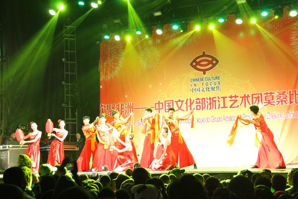 当地时间8月16日晚,在艺术节主会场伊尼扬巴内省体育馆,浙江艺术团举办了“欢聚非洲——中国文化部浙江艺术团莫桑比克之行”专场晚会。尽管时逢当地旱季,但演出开始前十分钟现场却突降大阵雨,艺术团在迅速调试被暴雨淋湿的设备并清理舞台后正常演出,歌舞、民乐、杂技、魔术节目精彩纷呈,激起了现场一万多观众的热情,观众与台上演员同声歌唱、一起舞动,杂技魔术节目更是赢得阵阵呐喊声、口哨声和喝彩声。