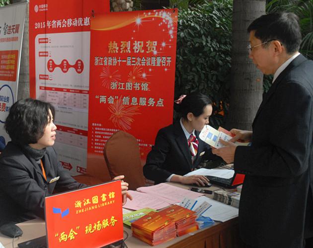 2015年浙江省人大、政协会议分别于1月21日、20日在杭州召开。浙江图书馆进驻省人大代表、政协驻地,设立信息服务咨询台,提供专题信息参考检索、数字资源利用、读者证办理等现场信息服务,免费发放《2015视界·浙江两会》光盘资料、《时事观察》和浙江网络图书馆数字阅读卡等,并在会议期间为“两会”代表提供24小时文献信息查找服务。