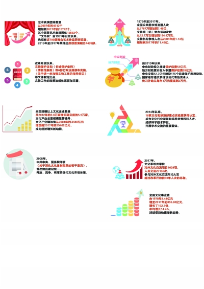 40年来,我国文化建设迈出历史性步伐,实现了翻天覆地的变化。从计划经济文化管理体制到社会主义市场经济的现代文化治理体系,从单纯依靠政府投入的文化事业到政府主导、社会参与的现代公共文化服务体系,从短缺的文化生产供给、零散的文化经营活动到繁荣活跃的现代文化产业和市场体系,从较为封闭单一的对外文化交流到以我为主、多层次、宽领域文化开放格局……翻开波澜壮阔的改革开放40年长卷,文化改革发展成绩斐然。