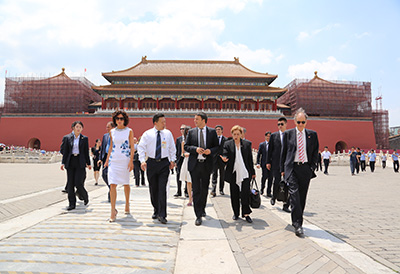 伦齐总理一行沿故宫中轴线参观。总理对故宫的历史和建筑非常感兴趣,时常提出问题与大家交流。行至乾清门时,伦齐总理应邀在留言簿上写道:“这个壮观的地方所承载的无与伦比的美丽令人感叹,我带来意大利政府和人民的问候,希望这份美好能为世界的未来与和平带来启迪”。