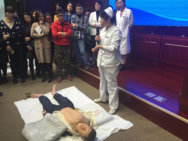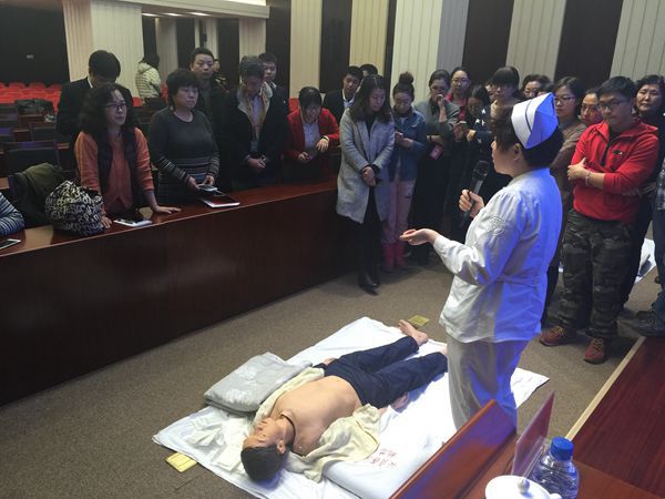 主任医师马涵英深入浅出、图文并茂地分析了心肺疾病的成因和多发前兆。教学护士长杜旭用人体模型进行心肺复苏急救示范,并详细讲解了判断呼吸、胸外心脏按压及人工呼吸等各个环节的具体方法和注意事项。