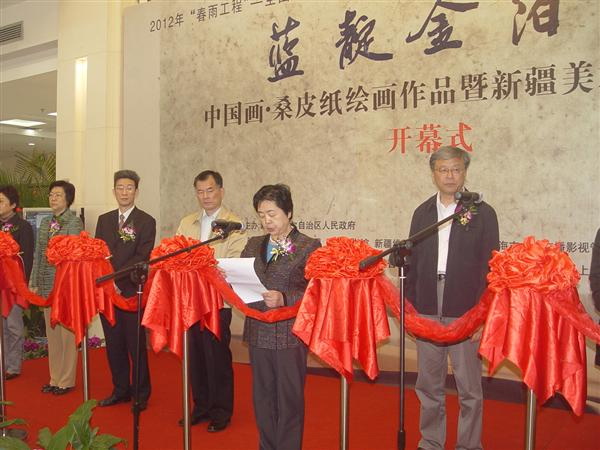 由新疆维吾尔自治区人民政府主办,文化部社会文化司、国家图书馆、新疆维吾尔自治区文化厅、上海市文化广播影视管理局承办,中国文化传媒集团有限公司、新疆维吾尔自治区文化馆、上海市长宁区文化局、长宁区图书馆等单位协办的2012年“春雨工程”全国文化志愿者边疆行之蓝靛金箔中国画·桑皮纸绘画作品暨新疆美术作品展于4月11日在上海市长宁区图书馆隆重开幕。新疆维吾尔自治区人大常委会副主任杜秦瑞出席开幕式并致辞。
