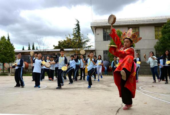 同学们在黄山完小学习体验纳西族传统祭祀东巴舞