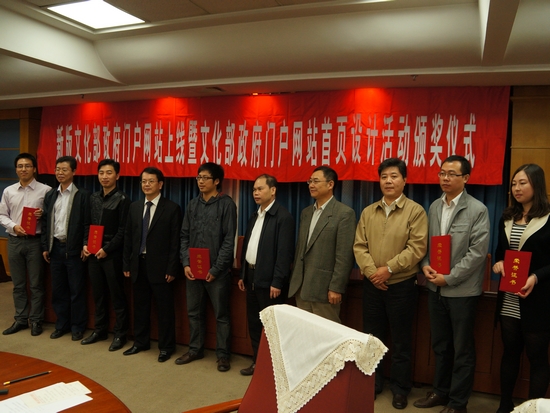 为更加广泛地集聚网友智慧,在视觉、设计、交互等方面全面提升文化部政府门户网站的用户体验效果,文化部信息中心面向社会公开征集网站首页设计作品。经过网络评审和专家评审两个环节,最终按照得分高低评选出一等奖1名,优秀奖10名。在今天的仪式上,参会领导对“文化部政府门户网站首页设计征集活动”获奖者表示感谢,并为他们颁奖。