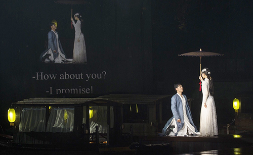 《青蛇》是田沁鑫导演2013年受香港艺术节、上海国际艺术节联合委约创排的剧目,2014年又赴美国肯尼迪艺术中心国际戏剧节、英国爱丁堡边缘艺术节演出,这部以现代方式演绎中国传统文化,具有“东方禅意”的剧目自首演以来一直深获好评。此次在乌镇水剧场露天演出,已是田沁鑫导演在一年半时间里根据不同场地和观众需求排出的第4个版本。是田沁鑫导演为“第二届乌镇戏剧节”量身定制的开幕大戏,2500名观众冒雨观看全场,大赞“完全不失戏剧本真的实景演出”,“创中国舞台演出之奇观”。周围建筑作为演出的主要场景,多媒体影像打在墙壁和水幕上,形成震撼的视觉冲击,巧妙的剧本构思,风趣的台词加上演员的精彩演绎,使在场观众感动不已。