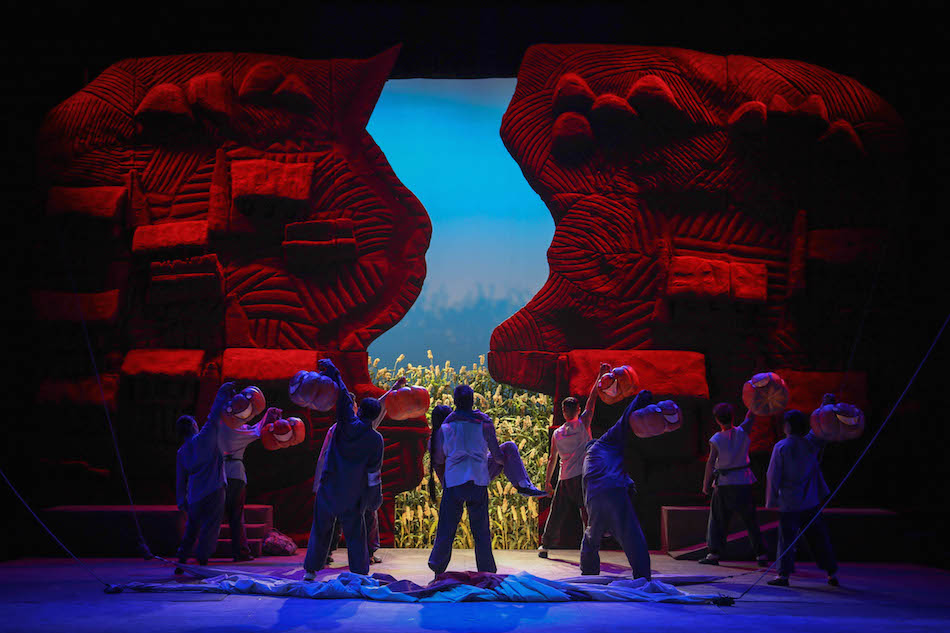 而为了舞台的可视性,田沁鑫对人物做了增删,并调整他们之间的关系,适当运用插叙、倒叙、定格等电影手段,将小说中的散点事件增减或凝练,推动剧情发展。台词则揉入萧红另一部作品《呼兰河传》的内容,比如“生老病死没什么大不了”,巧妙成为全剧点题之句。剧中互相缠绕的赵三与二里半两家,小说中并无交集,田沁鑫让他们的子女恋爱,而起恩怨冲突,串联起土地增税引发的农民暴动、妇女频繁生育导致的漠视生命的现象,直到日军入侵,外辱的力量将生老病死的和谐一点点打破,这幕反反复复上演的乡土戏剧,才宣告结束。
