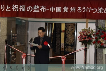 开幕式上,游庆桥代表中国美术馆致辞,他说文化交流是世界各国人民沟通情感、增进友谊的最佳形式,也是人类文明进取的象征。中国美术馆丰富的藏品长期以来为中外文化艺术交流发挥作用,精美的民间美术品更是重要的文化使者。美丽质朴的贵州蜡染为东京的早春增添气息,向日本人民表达美好的祝福和祈愿,使中日两国人民通过艺术分享现在,向往未来。