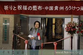江田五月在致辞中说,在纪念日中邦交正常化40周年之际,又逢新春到来,举办中国美术馆藏贵州蜡染展具有特别的意义。村上立躬在致辞中指出,此展是中日建交40周年系列活动的开始,日中友好会馆将与中国美术馆竭诚合作,继续努力办好各类展览,让更多的日本观众接触了解中国的文化,增进彼此的了解和友谊。他高度赞誉贵州蜡染艺术,并风趣的说,过去日本人民对贵州的印象可能只是观光地和茅台酒,希望通过此展,使贵州蜡染艺术像茅台酒一样深入人心。