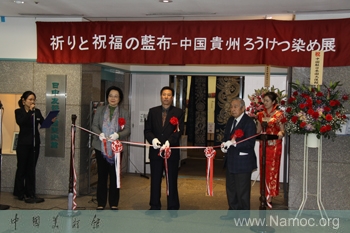 正值中国的壬辰新春之际,由中国美术馆与日中友好会馆共同主办的“山花烂漫——中国美术馆藏贵州蜡染艺术精品展”于2012年1月31日下午15时在日本东京日中友好会馆美术馆隆重开幕。在为期一个月的展览中,82件极具民族特色的贵州蜡染艺术珍品犹如烂漫的山花盛放在北国之春,为日本人民打开了一扇了解中国西南少数民族传统文化的大门。中国美术馆党委书记游庆桥、副馆长马书林携代表团、中国驻日本使馆公使衔文化参赞何静及使馆文化官员赵平、日中友好会馆会长(前参议院议长)江田五月、日中友好会馆理事长村上立躬、副会长谷野作太郎、日中文化交流协会代表理事佐藤纯子等出席了开幕式。游庆桥、何静、江田五月、村上立躬先后致辞并剪彩。