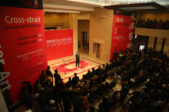 11月29日下午,由中国艺术研究院、中国美术家协会、中国美术馆、福建省文化厅联合主办,福建省美术馆、福建博物院、福建省艺术馆承办的“大漆艺术——2014海峡漆艺术大展”开幕式在中国美术馆举行。文化部副部长项兆伦、董伟,福建省人大常委会副主任刘群英,中宣部文艺局局长汤恒,中央美术学院院长范迪安等领导出席开幕式。中国艺术研究院副院长吕品田,中国美协秘书长徐里,中国美术馆馆长吴为山,福建省文化厅厅长陈秋平在开幕式上先后致辞。福建省文化厅副厅长陈吉主持开幕式。