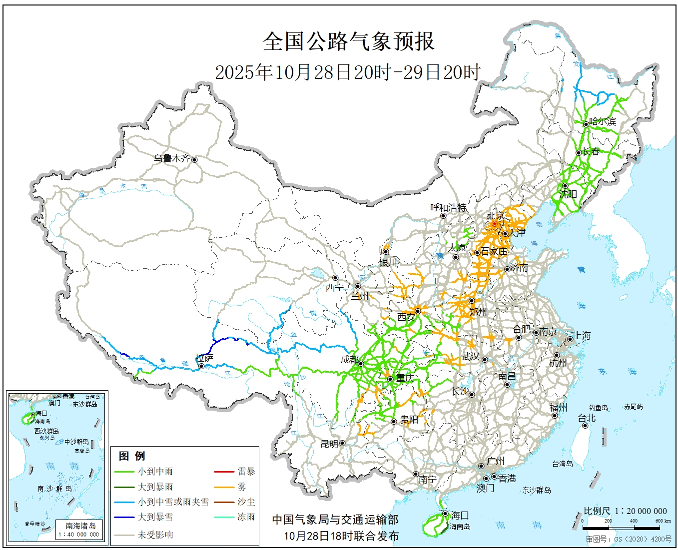 10月28日20时至29日20时,内蒙古东北部、黑龙江西北部、西藏东北部、青海南部、川西高原北部等地部分地区有小到中雪或雨夹雪,其中,西藏北部和南部、川西高原北部等地部分地区有中到大雪,局地有暴雪。西北地区东南部、东北地区中南部、山西北部、西藏中南部、江汉西部、西南地区东部、海南岛等地部分地区有小到中雨,其中,海南岛东南部等地的部分地区有大雨。另外,北京中南部和东北部、天津大部、河北中南部和东北部、山西南部、安徽中部、山东西北部、河南中北部和东南部、湖北中部和北部、重庆西南部、四川东南部、贵州东部和西南部、云南东北部、陕西中部和西北部、甘肃中东部、宁夏北部等地局地有雾。