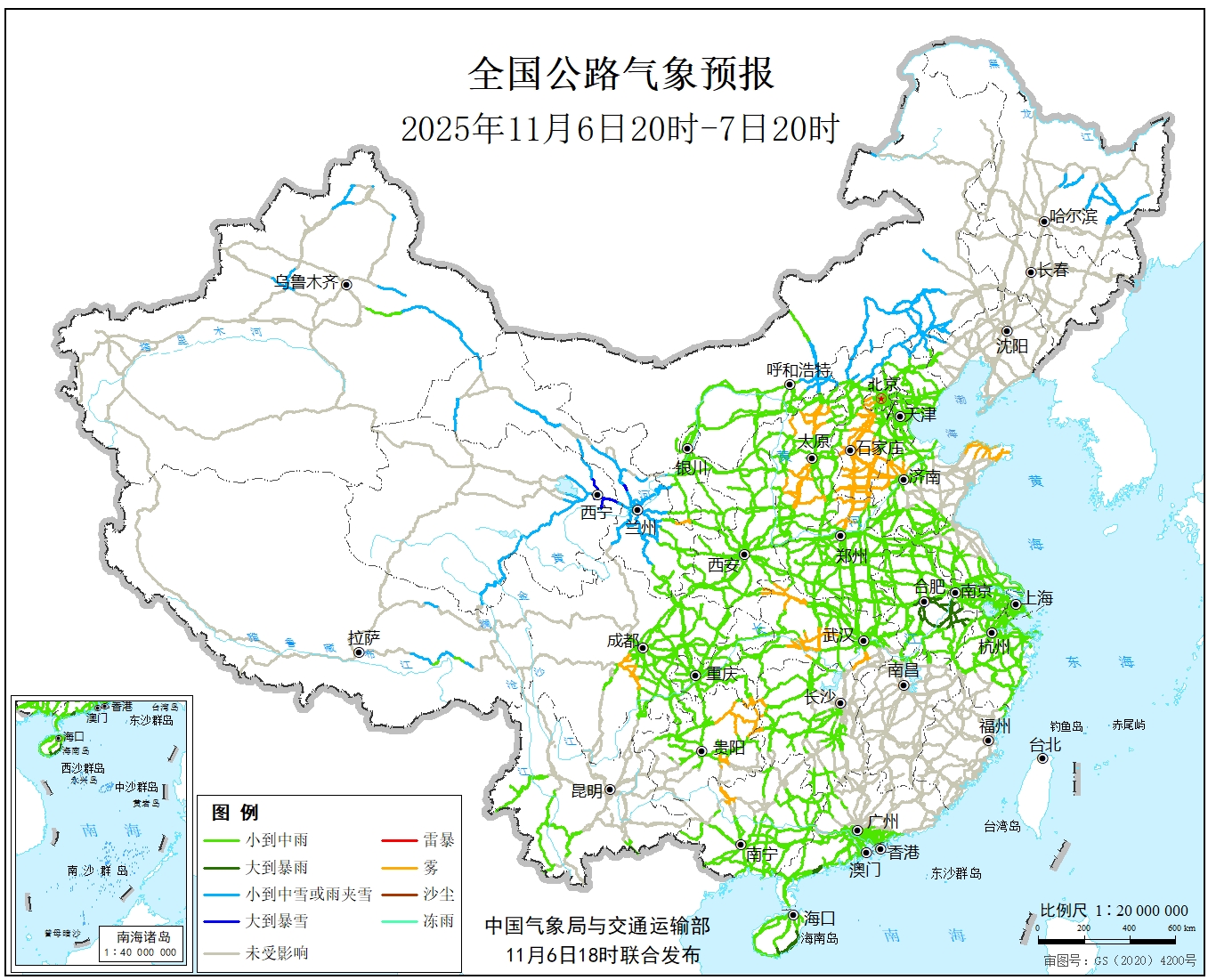 11月6日20时至7日20时,新疆北疆北部和东部、青海东部和南部、甘肃河西、内蒙古中西部、河北北部、黑龙江东部等地部分地区有小到中雪或雨夹雪,其中,新疆东部、青海东部等地局地有大到暴雪。内蒙古西部、西北地区东部、华北大部、黄淮大部、江淮、江汉、江南北部和东部、西南地区东部、云南西南部、华南大部等地部分地区有小到中雨,其中,安徽中南部、广东西南部沿海、海南岛东部等地局地有大雨。另外,北京西南部、河北中南部、河南北部、山东东北部、山西中北部、湖北中部、贵州东北部等地的部分地区有大雾。
