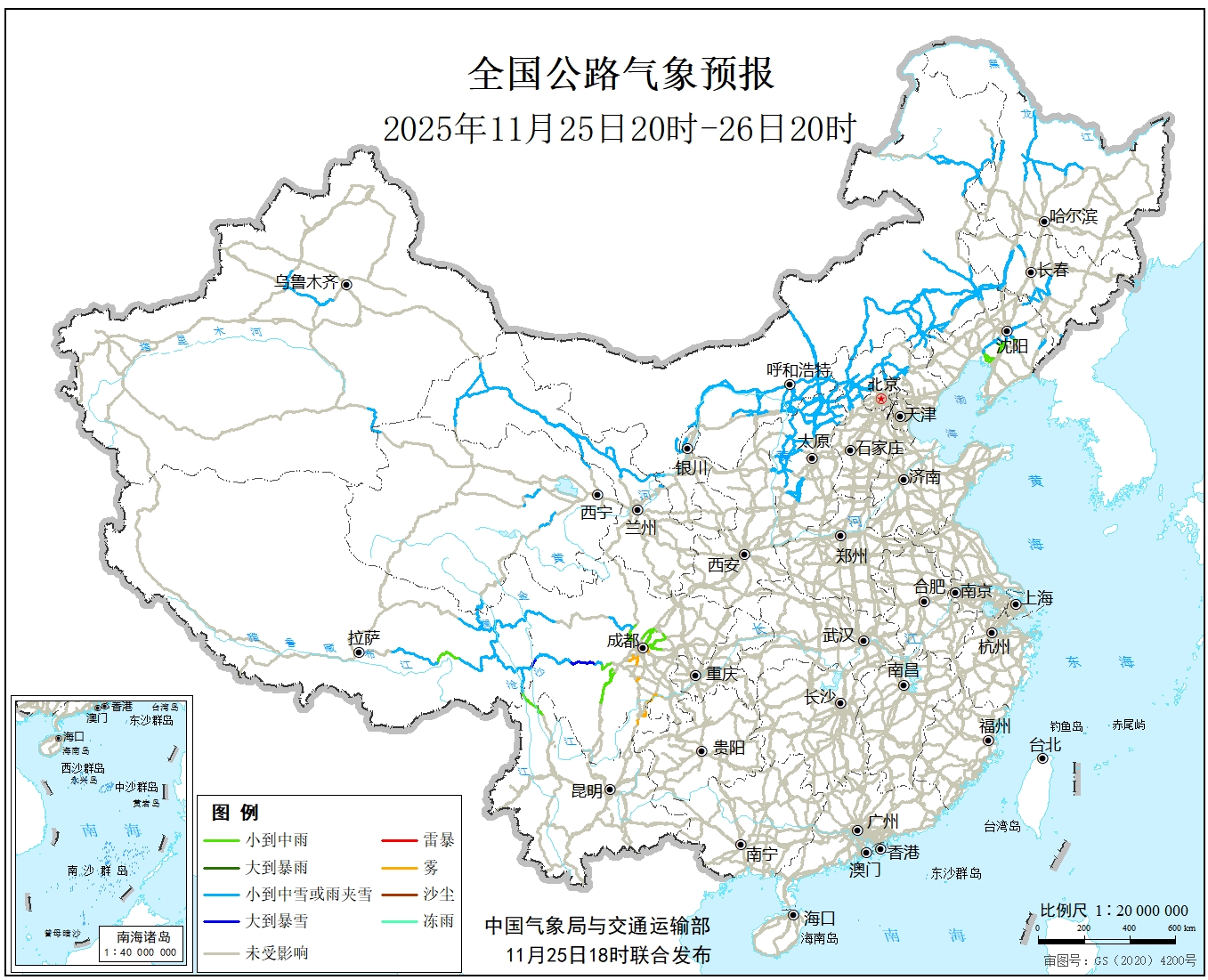 11月25日20时至26日20时,北京北部、河北北部、山西西部和北部、内蒙古大部、辽宁中部、吉林中部、黑龙江中西部、四川西部、西藏东部、甘肃北部、青海中部、新疆中部等地部分地区有小雪或雨夹雪,其中,川西高原局部地区有大雪。另外,四川中部局地有雾。