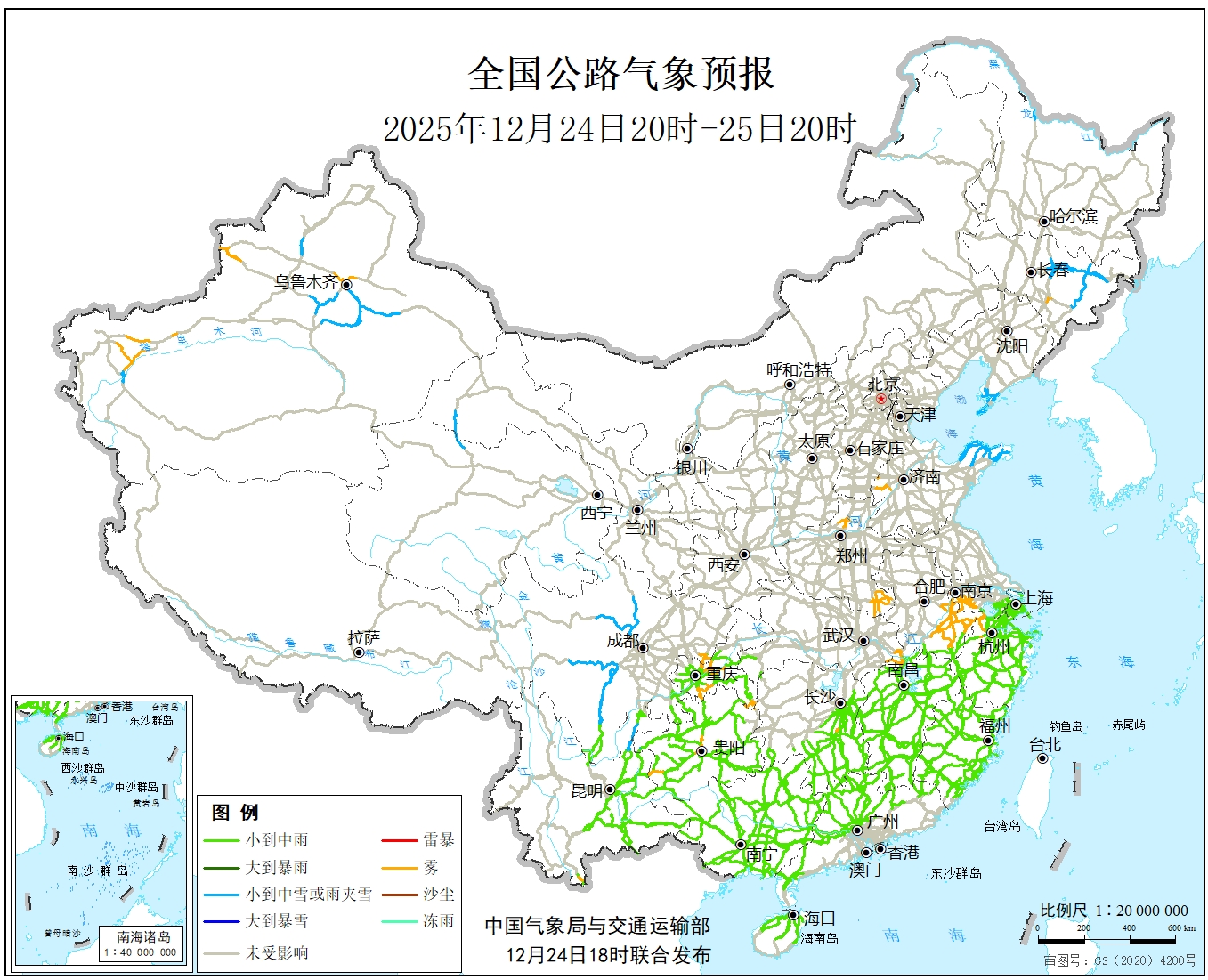 12月24日20时至25日20时,新疆沿天山地区和东部、川西高原东部和南部、山东半岛北部、辽东半岛南部等地部分地区有小雪或雨夹雪,其中,山东半岛东北部、川西高原南部等地部分地区有中到大雪。江南大部、华南北部和西部、西南地区中东部、台湾岛等地部分地区有小雨,局地中雨。另外,河北东南部、山东西部、河南北部和东南部、江苏西南部、安徽东南部、浙江西北部、湖北东南部、江西北部、湖南中部、重庆西北部和南部、四川中部、贵州中部、云南南部、新疆西北部等地局地有雾。
