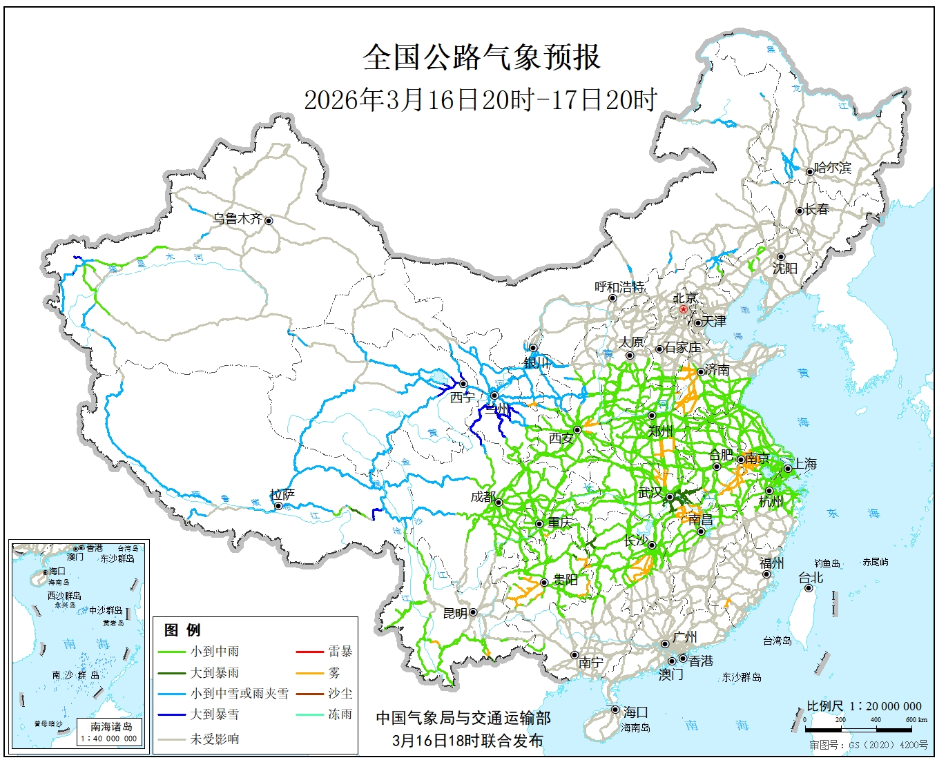 受大到暴雪影响的主要路段有: