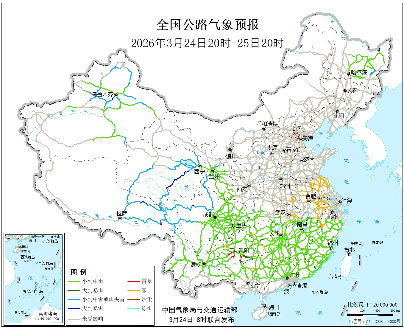 3月24日20时至25日20时,新疆北部和沿天山地区、西藏北部和东部、青海大部、甘肃南部、川西高原中北部、黑龙江西北部等地部分地区有小到中雪或雨夹雪,其中,新疆沿天山地区、西藏东北部、青海东南部、甘肃南部等地部分地区有大到暴雪,局地大暴雪;新疆南疆盆地、西藏东南部、四川东部和南部、云南中北部、贵州、湖北西南部、江南西部、华南北部、浙江东部、福建东部等地部分地区有小到中雨,其中,西藏东南部、贵州南部、湖南西南部等地部分地区有大雨,局地暴雨。另外,江苏北部和西南部、安徽中北部和东南部、湖北东南部、湖南北部和西部、贵州中南部等地局地有雾;贵州南部有雷暴。