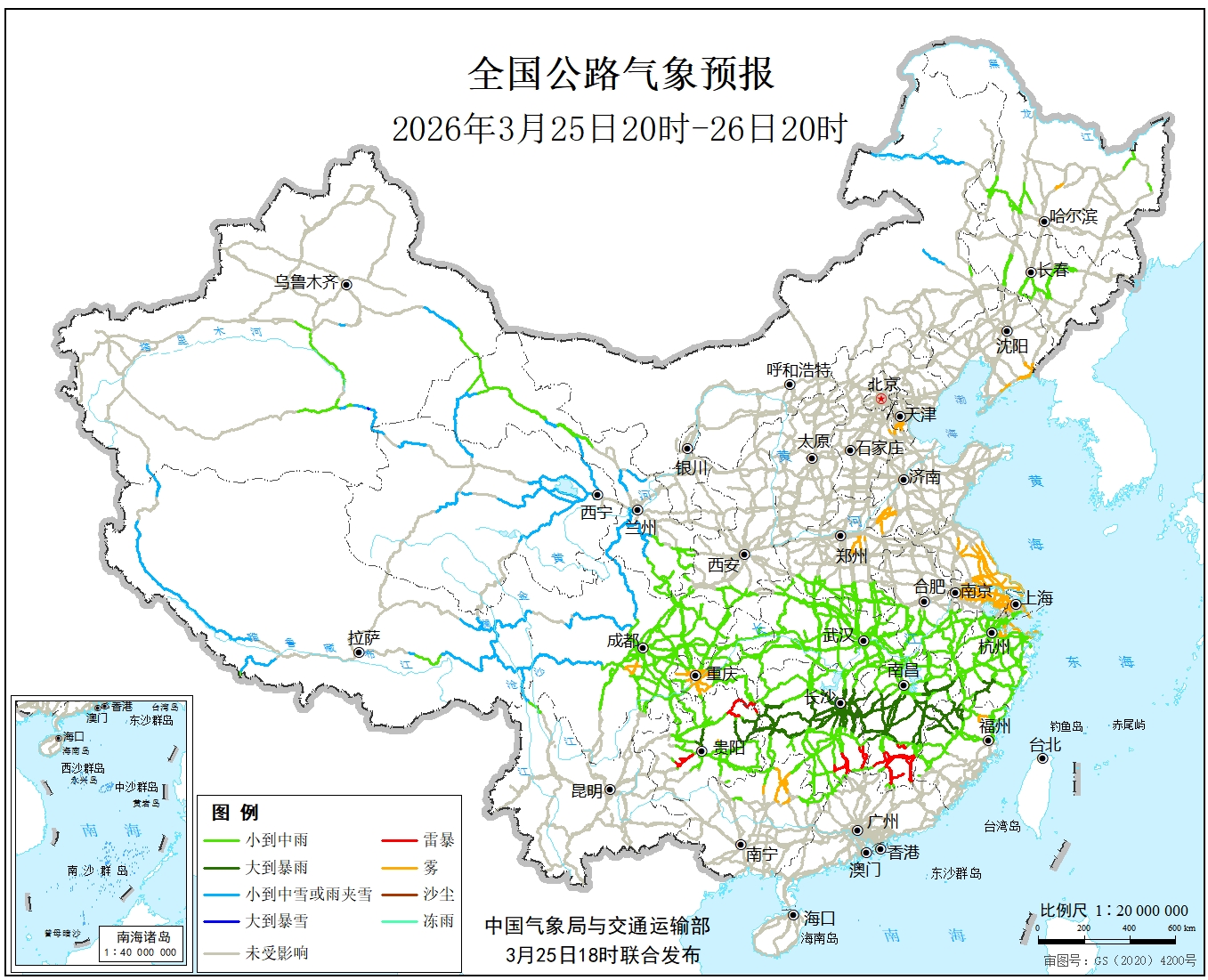 3月25日20时至26日20时,新疆东部、西藏南部和东部、青海北部和东部、甘肃祁连山区和西南部、川西高原北部、内蒙古东北部等地部分地区有小到中雪或雨夹雪,其中,新疆东部、甘肃河西等地局部地区有大雪。贵州中东部、重庆东南部、江南中北部等地部分地区有中到大雨,其中,湖南中部、江西中部、福建西北部等地部分地区有暴雨。另外,江苏大部、上海、广西北部、四川东部、重庆西部等地局地有雾;江西南部、湖南东南部、贵州东北部和西部有雷暴。
