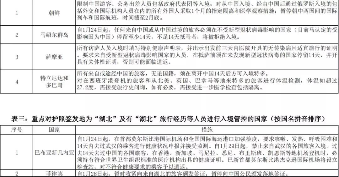 为防控新型冠状病毒感染的肺炎疫情,部分国家已在口岸采取了相应的入境管制措施(详见附表,供参考)。外交部领事司提醒中国公民根据自身健康状况合理安排出行,详细了解并遵守目的地国有关入境规定。