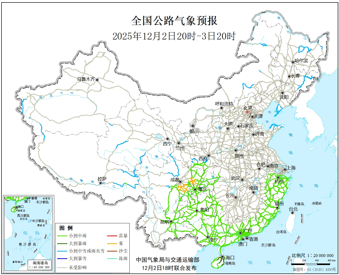 12月2日20时至3日20时,内蒙古东部、黑龙江东北部、吉林东部、辽东半岛、新疆南疆西部和南部、西藏北部和东部、青海南部、川西高原北部等地部分地区有小到中雪或雨夹雪。陕西南部、西南地区东部、华南、江南东部、海南岛等地部分地区有小到中雨,其中,海南岛东部局地有大到暴雨。另外,四川中东部、海南北部等地局地有雾。