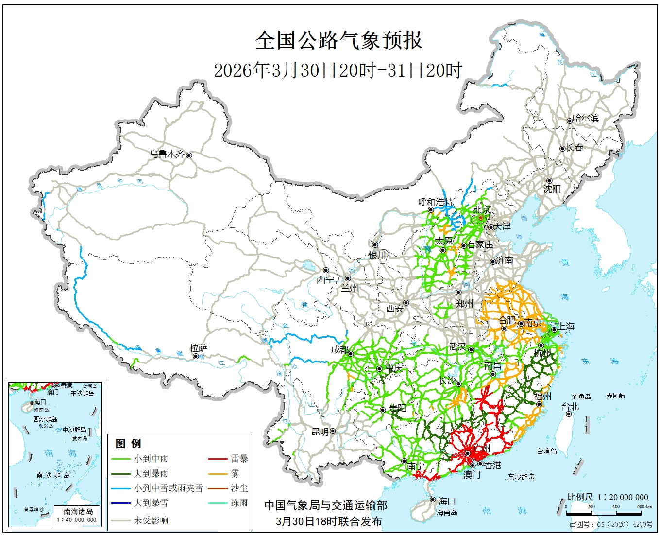 3月30日20时至31日20时,新疆南疆西部山区、西藏西部、川西高原、内蒙古中部和东北部、黑龙江西北部等地部分地区有小到中雪或雨夹雪;西南地区东部、江南大部、江淮南部、华南大部等地部分地区有中到大雨,其中,广西东北部、广东中部和北部、湖南南部、江西西南部和东部、福建西部和北部、浙江南部等地局地有暴雨(50~70毫米)。江西南部、广东大部、广西南部等地局地有雷暴。另外,山西东部、山东南部、安徽大部、江苏、江西中北部、湖南中部、浙江南部、福建北部和东部等地局地有雾。