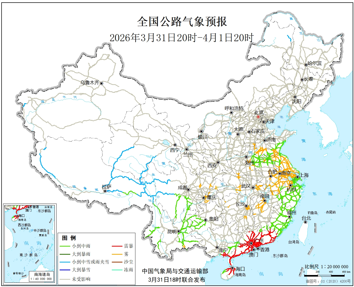 3月31日20时至4月1日20时,黑龙江西北部、新疆南疆盆地、西藏南部和东部、青海西部和南部、川西高原北部等地部分地区有小到中雪或雨夹雪。西藏东南部、西南地区中部、黄淮南部、江淮东部、江南东部、华南东部和南部、台湾岛等地部分地区有小到中雨,其中,浙江东部、福建东部、广东中东部和西南部、西藏东南部等地部分地区有大雨(25~45毫米)。广东、广西南部、海南北部等地局地有雷暴。另外,山东南部、安徽中南部、江苏西部、浙江中东部、福建中北部、江西中部以及河南南部、湖南东部、重庆中南部等地局地有雾。