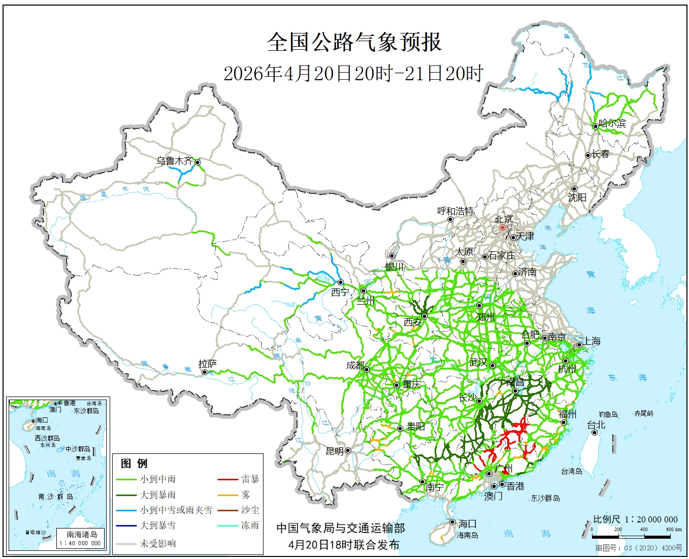 4月20日20时至21日20时,内蒙古东北部、黑龙江西北部、新疆沿天山地区、青海中部和东北部、甘肃河西等地部分地区有小雪或雨夹雪,其中,内蒙古东北部、黑龙江西北部等地部分地区有中到大雪。西北地区东南部、黄淮西部、江汉东部、江南大部、四川盆地东北部、华南西部、北部和东南部等地部分地区有中到大雨,其中,湖南南部和东部、江西中北部、广西东北部等地部分地区有暴雨,局地大暴雨。另外,安徽南部、浙江南部、福建东部和南部、广东中东部、广西中西部、重庆西部、贵州西南部、陕西西南部等地局地有雾。