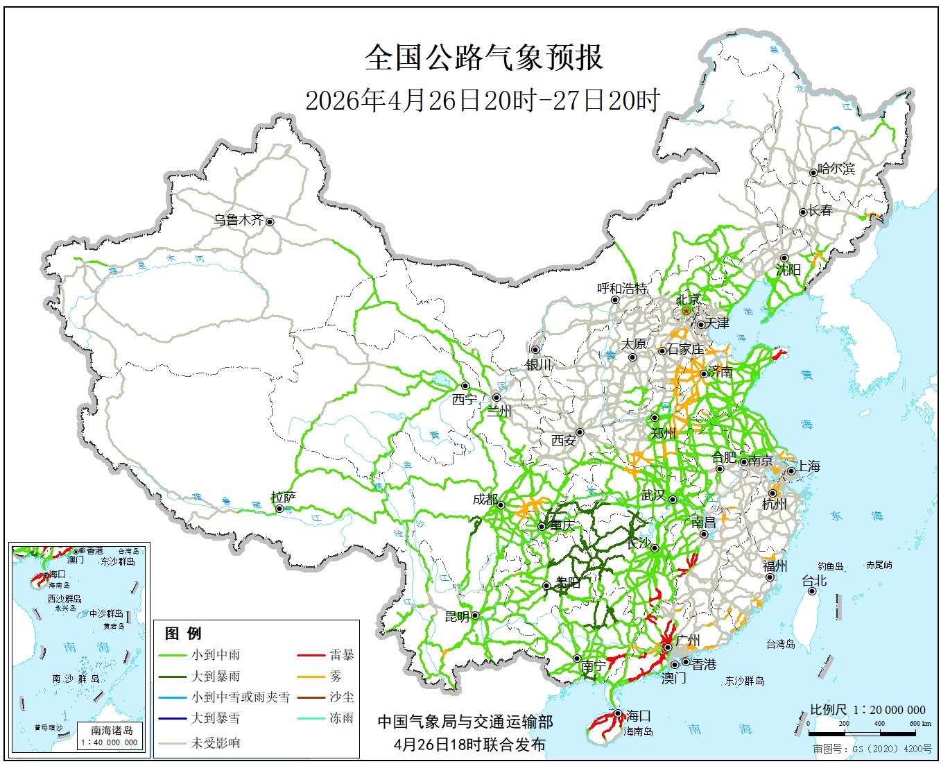 4月26日20时至27日20时,黑龙江北部、青海北部和西部、甘肃河西等地部分地区有雨夹雪。江汉东部、江南西部、川西高原北部、西南地区东部、华南西部以及内蒙古东南部、辽宁南部等地部分地区有中到大雨,其中,湖南北部和西部、重庆中部、贵州东北部、广西东北部等地部分地区有暴雨。江西西部、山东东北部、湖南南部、广东中西部、广西东南部、海南岛大部等地局地有雷暴。另外,河北南部、山东西部、河南东部、广东东部、四川东北部等地局地有雾。