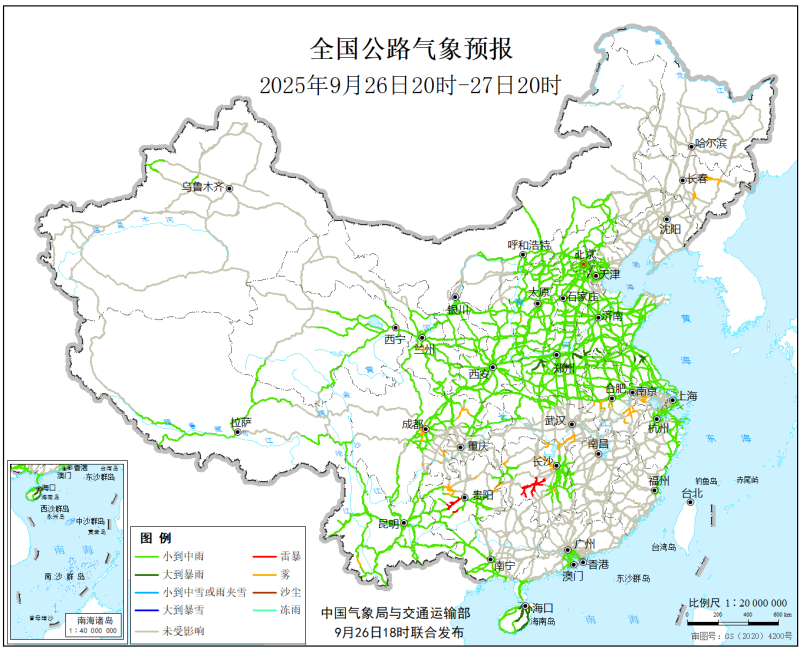中国气象局与交通运输部2025年9月26日联合发布全国主要公路气象预报