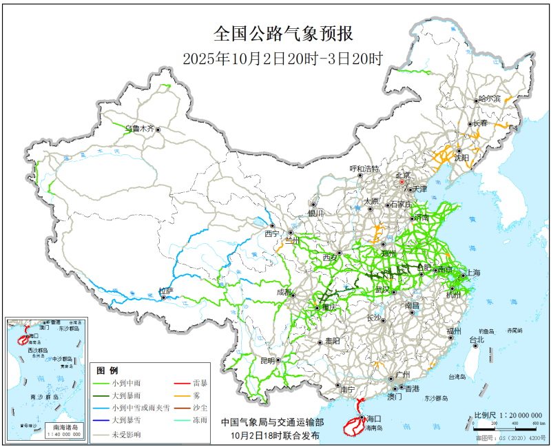 中国气象局与交通运输部2025年10月2日联合发布全国主要公路气象预报