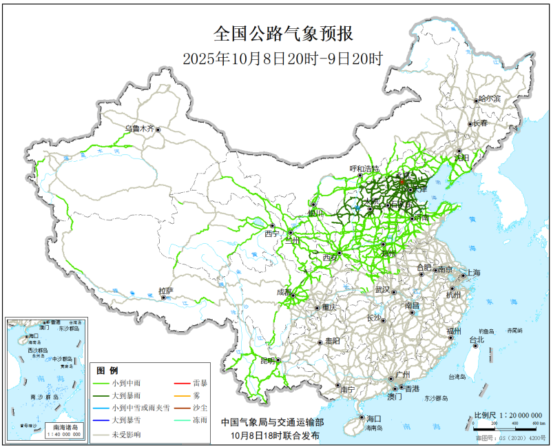 中国气象局与交通运输部2025年10月8日联合发布全国主要公路气象预报