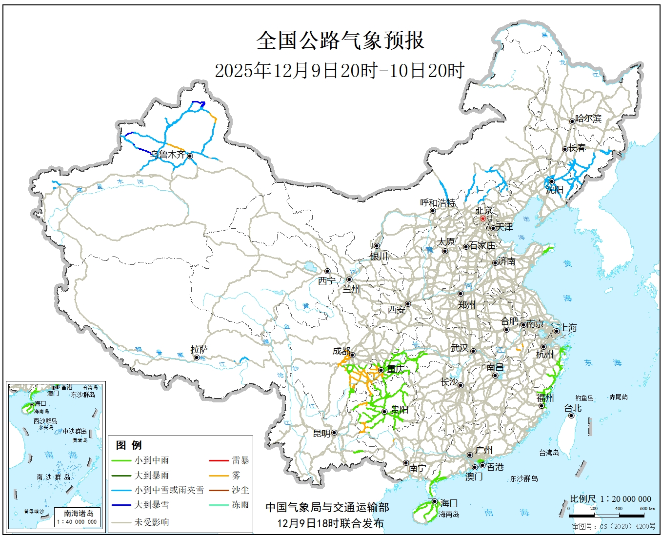 12月9日20时至10日20时,新疆西部、内蒙古中部、黑龙江北部、吉林东部、辽宁北部等地部分地区有小到中雪或雨夹雪,其中,新疆北部、吉林东南部等地部分地区有大到暴雪。西南地区东部、福建东北部、浙江东部、山东半岛、海南岛等地部分地区有小雨,其中,海南岛东部等地部分地区有中雨。另外,安徽南部、重庆西南部、四川中东部、贵州西部等地局地有雾。