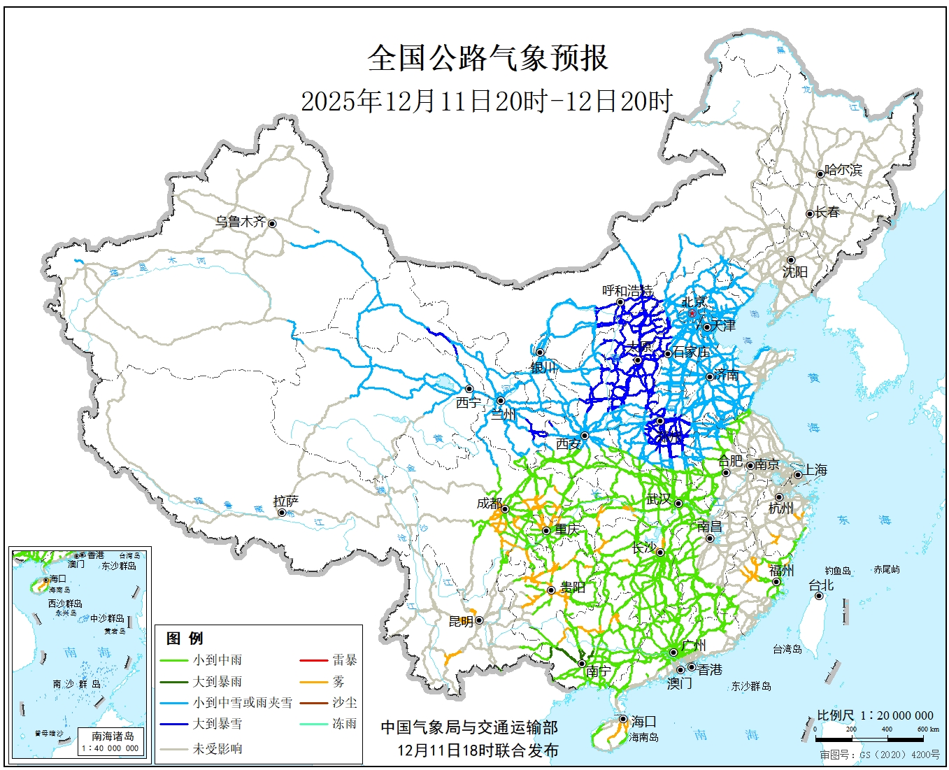 12月11日20时至12日20时,新疆东部、内蒙古中西部、青海北部、甘肃、陕西、华北、黄淮大部、安徽北部等地部分地区有小到中雪或雨夹雪,其中,甘肃中部和东南部、内蒙古河套地区、陕西中北部、山西、河北西部、河南中北部等地部分地区有大到暴雪。江淮西部、江汉、江南西部、西南地区东部、华南、海南岛等地部分地区有小到中雨,局地大雨。另外,浙江南部、福建北部、湖南北部、湖北西南部、四川盆地中西部、贵州中西部、广西北部、云南中部、海南岛中部等地局地有雾。
