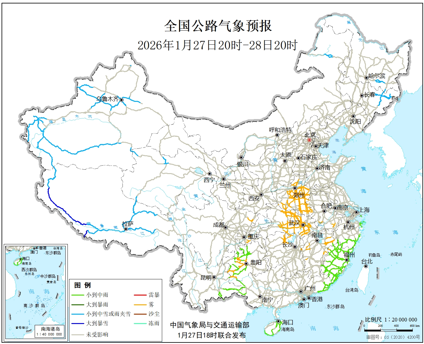 1月27日20时至28日20时,新疆北部、西藏西部和南部等地部分地区有中到大雪,其中,西藏西南部沿山地区有暴雪到大暴雪,局地特大暴雪。江南东部、贵州中部、云南东南部、广西西部、广东东南部、海南岛等地部分地区有小到中雨。另外,河南大部、湖北中东部、安徽南部、江西西部和东北部、湖南北部、四川东部、重庆西南部、贵州西部等地局地有雾。