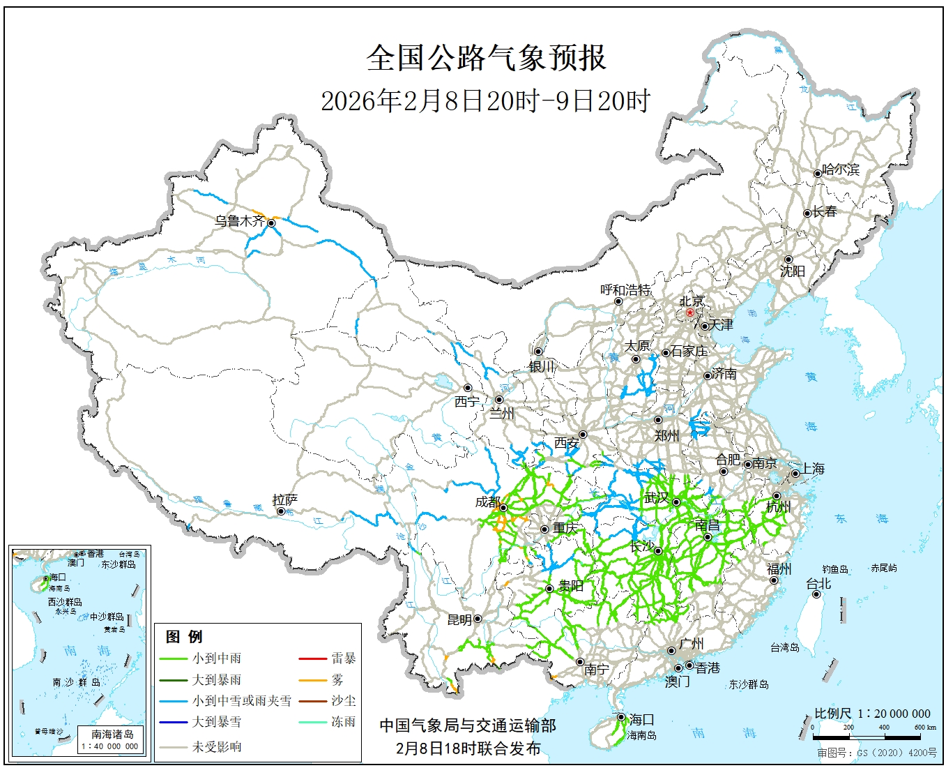 2月8日20时至9日20时,新疆东部、西藏东北部、青海北部、川西高原东北部、甘肃河西和南部、陕西南部、山西南部、湖北西部、湖南西北部、贵州北部等地部分地区有小雪或雨夹雪,局地有中雪;贵州东北部、湖南西部等地高海拔山区有冻雨。江汉东部、江淮西部、江南大部及四川盆地、重庆东部、贵州中东部、云南南部、广西西部和北部、海南岛东北部等地部分地区有小雨。另外,广西西南部、四川中东部、贵州西部、云南南部、新疆北疆南部等地局地有雾。