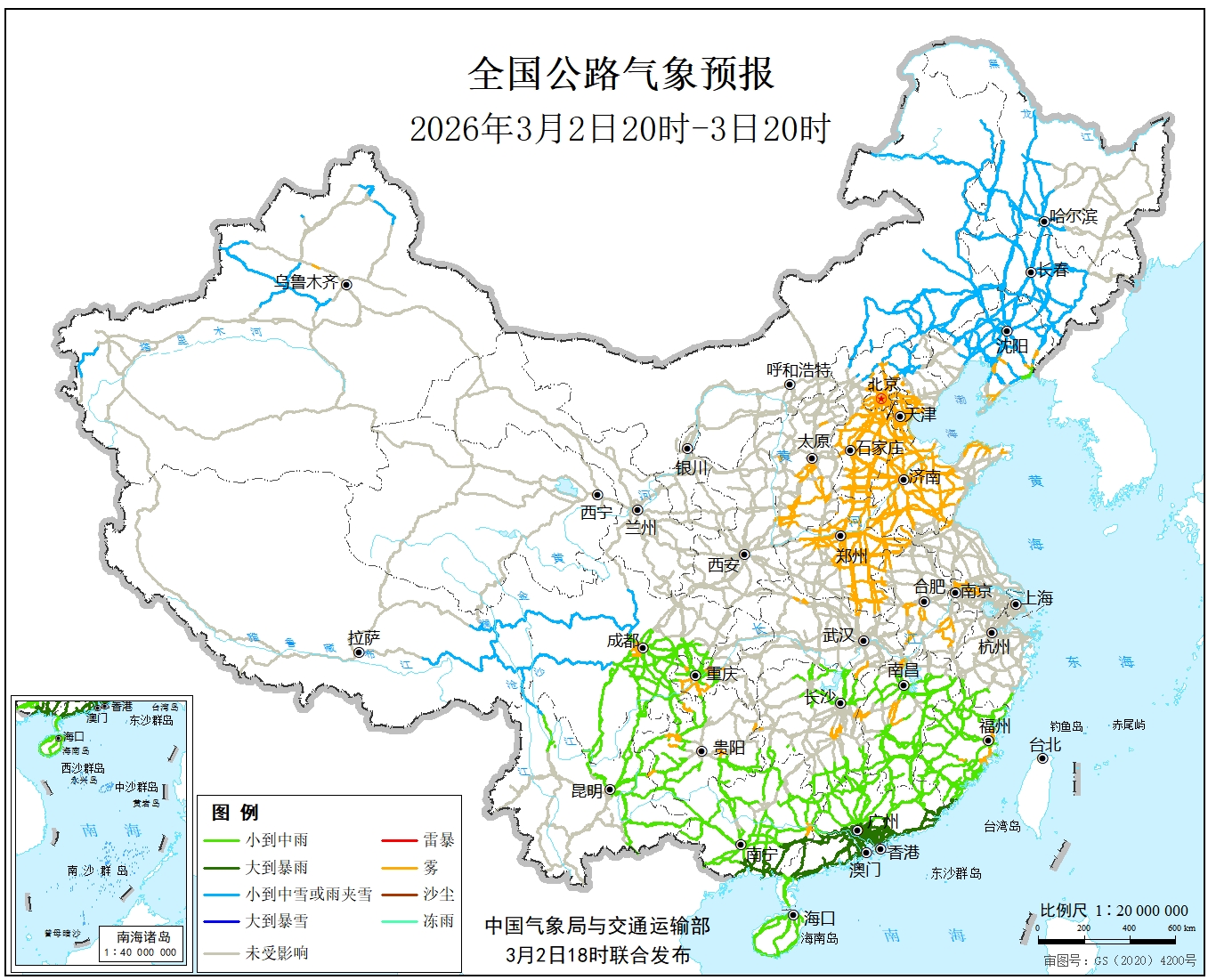 3月2日20时至3日20时,新疆北部、西藏东南部、内蒙古东部、东北地区西部、华北北部等地部分地区有小到中雪或雨夹雪,其中,内蒙古东北部、黑龙江西部等地部分地区有大雪(5~9毫米);西藏东南部、川西高原、重庆西部、云南东部、贵州西部、江南中南部、华南南部有小到中雨,其中福建东南部、广东南部、广西东南部等地部分地区有大雨,局地暴雨(50~60毫米)。另外,北京、天津、河北中南部、河南中东部、山东中西部等地局地有雾。