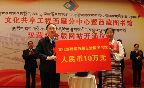 文化部副部长杨志今(左)向西藏图书馆赠送人民币十万元