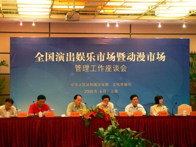 2008年6月25日--27日,文化部文化市场司在上海召开全国娱乐演出市场暨动漫市场管理工作座谈会,此次会议是贯彻落实文化部下发的《关于开展全国卡拉OK内容管理服务系统建设工作的通知》文件精神,总结交流试点工作,对开展全国娱乐场所卡拉OK内容管理服务建设工作进行部署,进一步贯彻落实《关于构建合理演出市场供应体系,促进演出市场发展繁荣的若干意见》。交流研究动漫市场管理的工作问题,来自全国各省、自治区、直辖市文化厅(局)文化市场管理部门的负责人50余人参加会议。