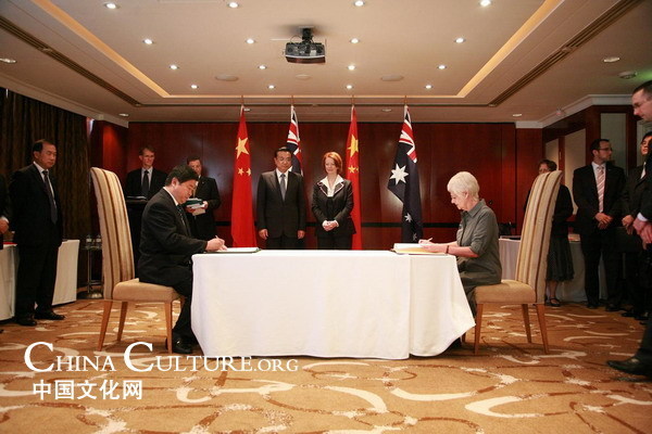 正在对澳进行正式访问的中国国务院副总理李克强与澳大利亚副总理吉拉德共同出席了签字仪式。