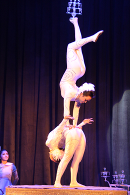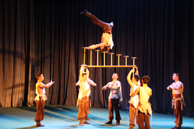 邱大使致辞 在随后进行的演出中,节目异彩纷呈,高潮迭起,充分展现了中国杂技的魅力和美感。演员们以纯熟的技巧和恰到好处的表现力,为观众带来了一台富有中国传统文化特色的视觉盛宴。《普陀佛光》流光溢彩,演员之间互相叠架、攀扶,形成千手观音的绚丽画面,同时让人不禁为他们的柔韧和力量拍案叫绝。《西湖明珠》结合江南水乡的柔婉格调,给令人屏息的滚杯表演增添了优雅含蓄的韵致。头顶技巧《天台功夫》通过演员过硬的头颈功夫和绝佳的平衡能力,向观众展示了武术和杂技结合的强大气魄。灵动诙谐而又动人心魄的《晃板弹碗》和《膳房斗技》等节目演出时,着迷的观众被演员的精彩表现牵动着目光,不时发出阵阵笑声和惊叹。绸吊杂技《梁祝》伴着缠绵悱恻的音乐,以光影的交错和演员高难度的舞步征服了在场的所有观众,将现场的气氛推向高潮。整台演出期间,观众席上掌声时时如同雷鸣般响起,欢呼声不绝于耳,剧场的过道都挤得满满的,许多观众甚至站在后排角落观看了所有节目。