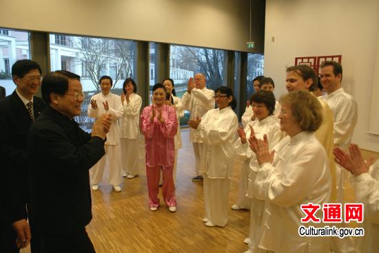 蔡武观看了即将展出的“永远的春天—栾海伦个人画展”,并倾听了青年艺术家栾海伦女士对其创作作品的介绍。随后,蔡武欣赏了由文化中心太极班中、德学员们表演的杨氏太极拳,详细了解了学员们学习太极的切身感受,对他们连续三年坚持在文化中心学习太极表示赞赏,并和学员们合影留念。 蔡武还详细询问了文化中心的藏书和借阅情况,强调文化中心图书馆要加强数字资源的建设,为不同类型的读者提供适合他们需要的图书资料,既要有初级读物,也要有能为汉学研究提供帮助的文献。在阅览室里,蔡部长还与正在阅览中文报刊的德国读者进行了简短交谈。 在二楼中文初级班教室,蔡武与年龄最小的中文学员亲切交谈,鼓励他要从小学好中文,长大后为中德文化交流作贡献。中级班的德国学员为蔡部长演唱了中文歌曲《新年好》。 蔡武对加强对外文化交流以及加快海外中国文化中心建设作了重要指示,强调指出,对外文化交流要注意“三贴近”,一要贴近外国人对中国文化的需求,了解外国公众对中国文化的兴趣点;二要贴近一个全面的、真实的中国,要让世界了解中国优秀的传统文化和典型的当代文化;三要贴近现代文化传播方式,让外国人能够和乐于接受。他表示,我们不输出自己的意识形态、发展模式和价值观念,但是我们要向外国人介绍中国人在做什么,中国人在想什么,为什么中国是这样,要通过文化这个切入点,来增进各国对中国的全面了解和客观认识。 蔡武最后提出,在对外文化交流过程中,文化中心发挥着重要的平台和纽带作用。柏林中国文化中心要乘着党的十七届六中全会推动文化大发展大繁荣的东风加快发展,并对今后其它文化中心的建设和发展起到示范作用。 |