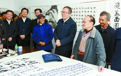 2011年10月29日,李鸿忠(右三)在湖北省咸宁市咸安区银泉社区调研基层群众文化生活。