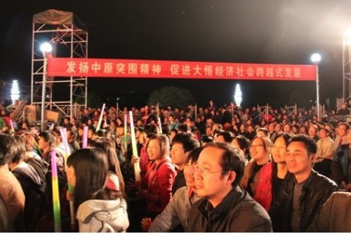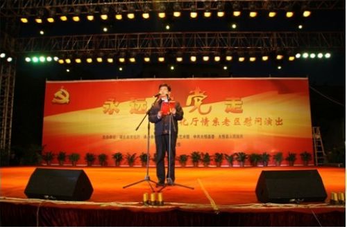 当晚,在大悟县滨河广场,省文化厅举办了一场“永远跟党走——情系老区”大型慰问演出。省群艺馆、湖北艺术职业学院、省京剧院、省地方戏曲艺术剧院、武汉邮政艺术团等单位优秀演员的精彩演出吸引了近万名观众到现场观看。